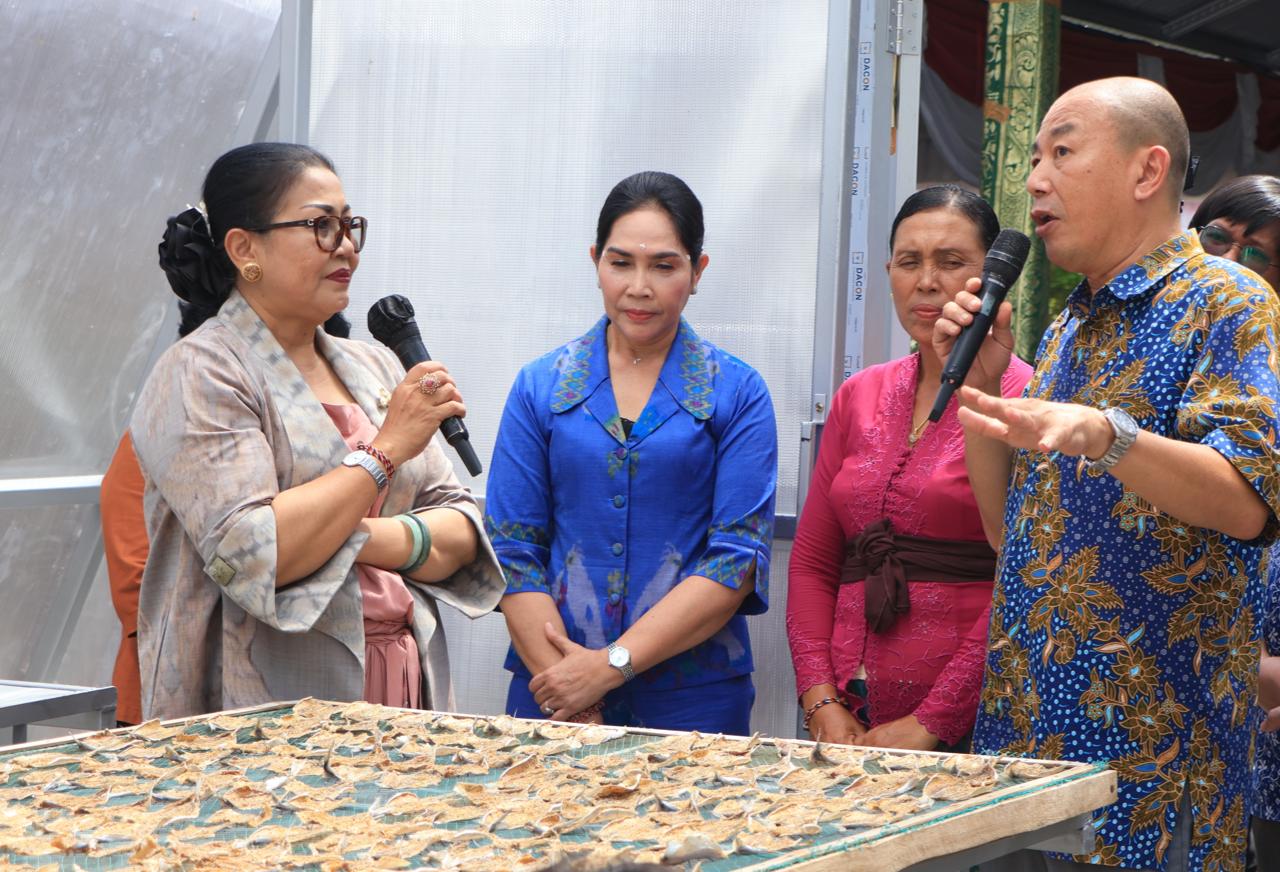 BALIPUSTAKANEWS, JEMBRANA – Ketua Tim Penggerak PKK Provinsi Bali Ny. Putri Koster mengajak anggota Kelompok Wanita Tani Bedetan Perancak untuk tetap menjaga sinergitas dan kerjasama dengan nelayan dan stakeholder terkait dalam mengembangkan produksi bedetan (olahan ikan lemuru yang dikeringkan) di Perancak. Hal ini disampaikan dalam sambutannya sesaat sebelum meresmikan Kawasan Produksi Produk Bedetan Perancak Jembrana Kerthi Bali Research Center, di Perancak – Jembrana, Bali, Jumat (2/6).