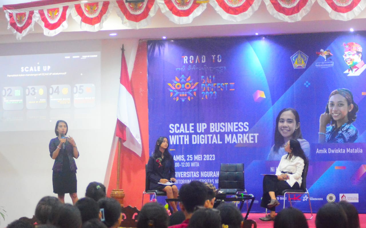 BALIPUSTAKANEWS, DENPASAR – Denpasar – Gelaran event Bali Digital Festival (Bali Digifest) 2023 kembali menyapa kalangan mahasiswa. Kali ini, lewat Roadshow Kampus Bali Digifest hadir di Kampus Universitas Ngurah Rai, Denpasar, Kamis (25/5) pagi. Kali ini, rangkaian event yang merupakan salah satu program unggulan Pemerintah Provinsi Bali sebagai upaya menghidupkan dan mengembangkan industri kreatif dan digital Bali ini menghadirkan tema ‘Scale Up Business with Digital Market’. Seminar Digital kreatif ini menghadirkan dua narasumber sekaligus praktisi digital marketing yakni Ni Komang Ayu Septiani (Praktisi UMKM) dan Amik Dwiokta Matalia (Social Media Marketing) dihadiri lebih dari 200 mahasiswa/i.