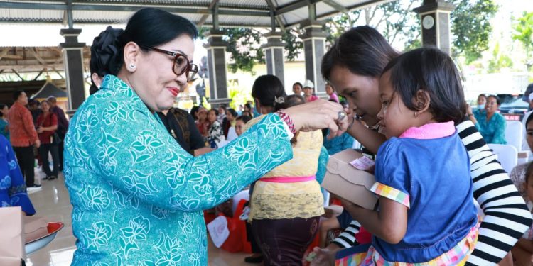 BALIPUSTAKANEWS, JEMBRANA – Ketua TP PKK Provinsi Bali Ny. Putri Suastini Koster tidak kenal lelah untuk kembali menggelar aksi sosial yang bertajuk “Aksi Sosial Ketua Tim Penggerak PKK Provinsi Bali Menyapa dan Berbagi”. Pada hari pertama kunjungan kerja ke Kabupaten Jembrana, Ketua TP PKK gelar aksi sosial dan sosialisasi di empat desa di dua Kecamatan di Kabupaten Jembrana pada Jumat (3/3).