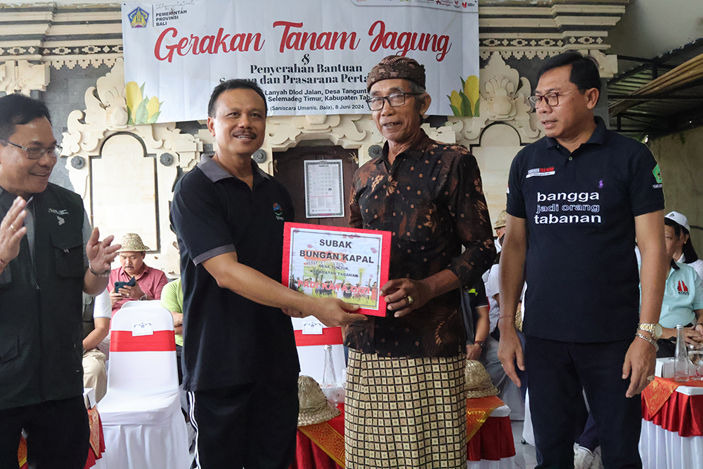 Dalam kesempatan tersebut, Sekda Dewa Indra juga secara simbolis melakukan penanaman benih jagung di areal lahan setempat bersama sejumlah undangan VIP lain. Selain itu, secara simbolis juga diberikan bantuan berupa traktor roda 2, pompa air, pupuk organik, bibit padi inbrida, bibit padi kaya gizi dan bibit jagung kepada perwakilan kelompok petani di Kabupaten Tabanan.