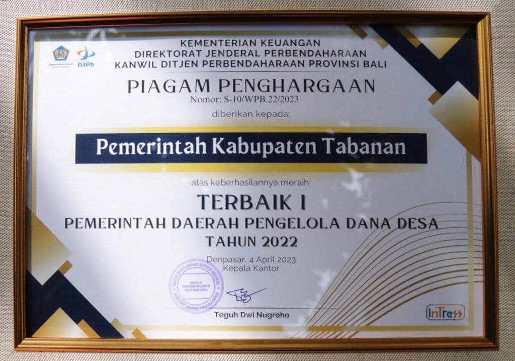 Di kesempatan tersebut, Sekda Susila sekaligus menerima Piagam Penghargaan yang diberikan kepada Pemerintah Kabupaten Tabanan atas keberhasilan meraih Terbaik I, Pemerintah Daerah Pengelola Dana Desa Tahun 2022 oleh Kementerian Keuangan, Direktorat Jenderal Perbendaharaan Kanwil Ditjen Perbendaharaan Provinsi Bali. Rakor tersebut dihadiri oleh Sekda Provinsi Bali, Sekda Gianyar, KA Kanwil DJPb Provinsi Bali, KA Subdir Pelaksanaan Anggaran IV.
