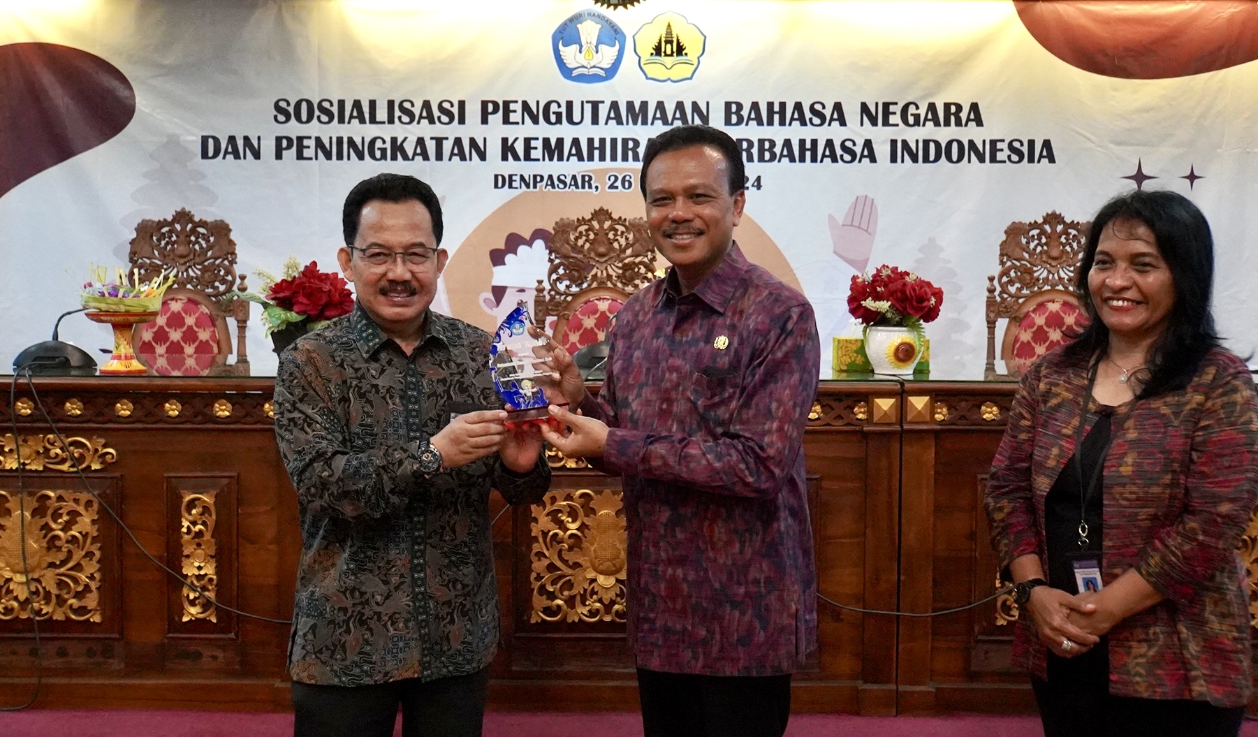 Kegiatan Sosialisasi Pengutamaan Bahasa Negara dan Peningkatan Kemahiran Berbahasa Indonesia yang diselenggarakan oleh Balai Bahasa Provinsi Bali pada pagi hari ini turut dihadiri oleh Kepala Balai Bahasa Provinsi Bali, Valentina Lovina Tanate, Kepala Biro Organisasi Setda Provinsi Bali, Ketut Nayaka dan diikuti oleh 40 ASN di lingkungan Pemprov Bali. (PR)