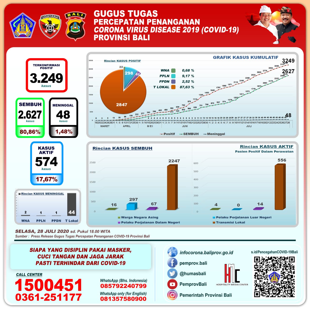 BALIPUSTAKANEWS, Denpasar —. Gugus Tugas Percepatan Penanganan COVID-19 Provinsi Bali menyampaikan perkembangan Penanganan Corona Virus Disease (COVID-19) di Provinsi Bali. Diinformasikan jumlah kumulatif pasien positif 3.249, bertambah 30 transmisi lokal. Tim Gugus Tugas Percepatan Penanganan Covid-19 Provinsi Bali mencatat angka kesembuhan pasien Covid-19 terus naik. Hari ini total pasien yang sembuh sebanyak 2.627 (bertambah 57 transmisi lokal). Persentase pasien sembuh mencapai 80,86%. Selasa (28/7).