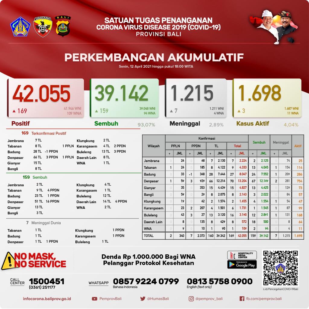 BALIPUSTAKANEWS,DENPASAR – Pertambahan kasus hari ini , TERKONFIRMASI sebanyak 169 orang (159 orang melalui Transmisi Lokal, 8 PPDN dan 2 PPLN) SEMBUH sebanyak 159 orang, dan 7 orang Meninggal Dunia.