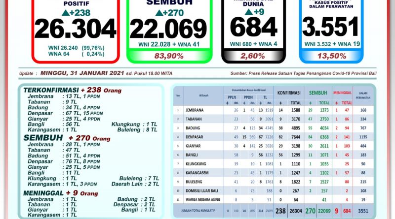 Update Covid 19 Bali, 31 Januari 2021, Kasus Sembuh 270 & Kasus Sembuh 238 Orang
