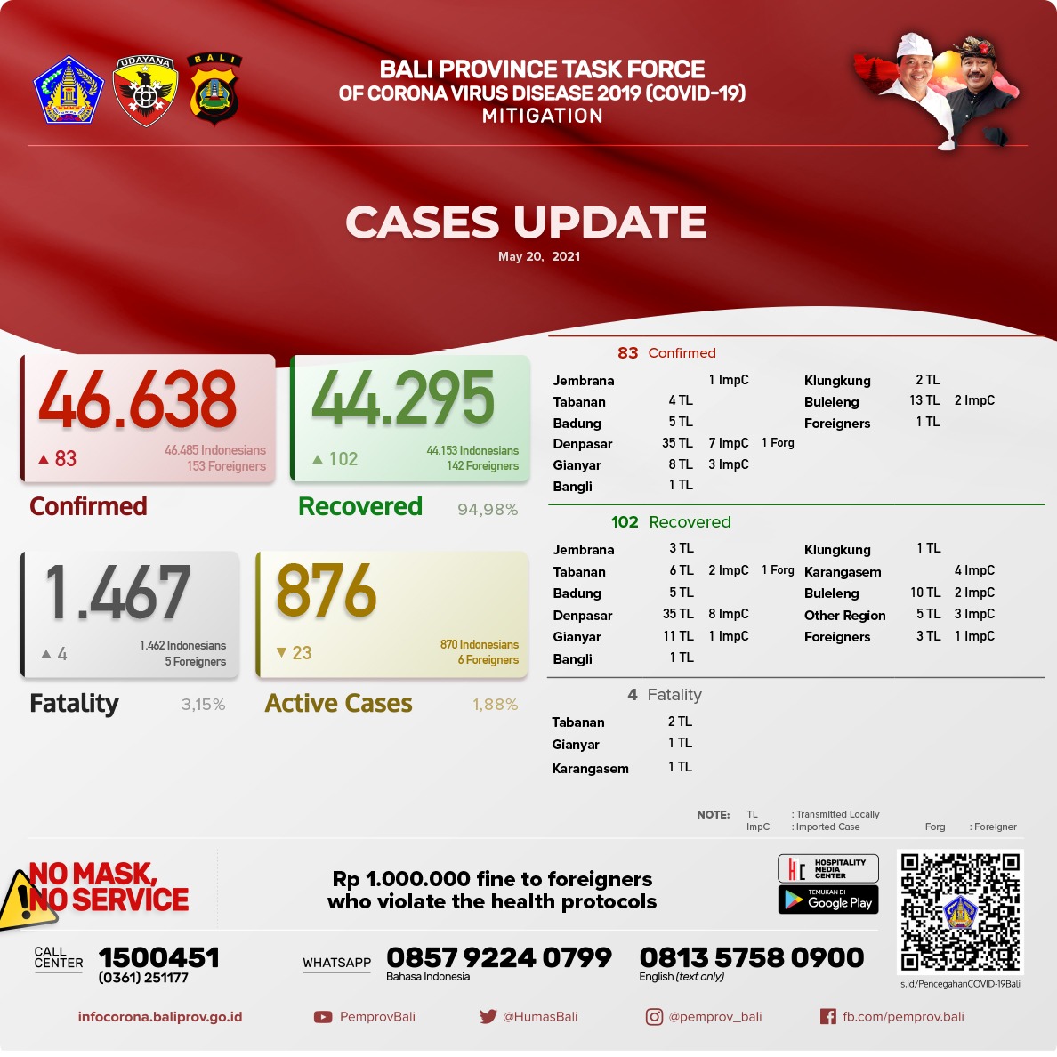 Jumlah kasus secara kumulatif ,TERKONFIRMASI 46.638 orang, SEMBUH 44.295 orang (94,98%), dan Meninggal Dunia 1.467 orang (3,15%). Kasus Aktif per hari ini menjadi 876 orang (1,88%).