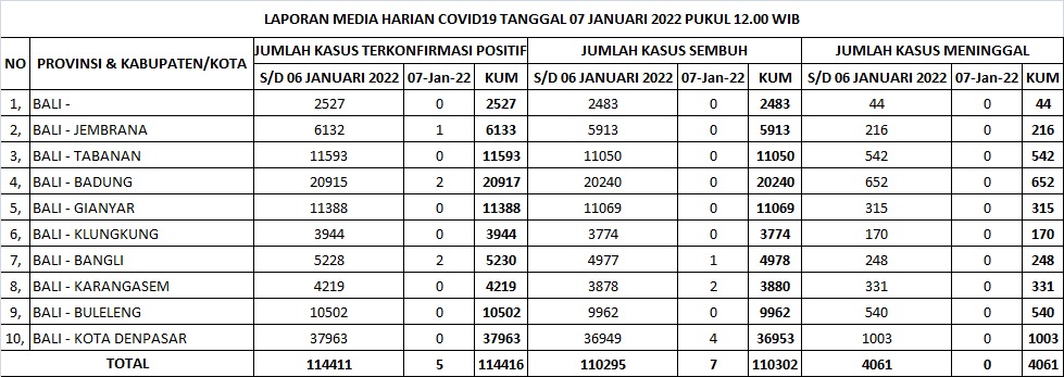 BALIPUSTAKANEWSW,DENPASAR – Terkonfirmasi kasus baru Covid 19 di Bali hari ini , Jum’at, 07 Januari 2022 mencapai 5 orang, sementara kasus sembuh bertambah 7 orang. Kasus meninggal bertambah nihil. Data ini diperoleh dari Satgas Penanganan Covid-19 Bali melalui Humas Pemprov Bali.
