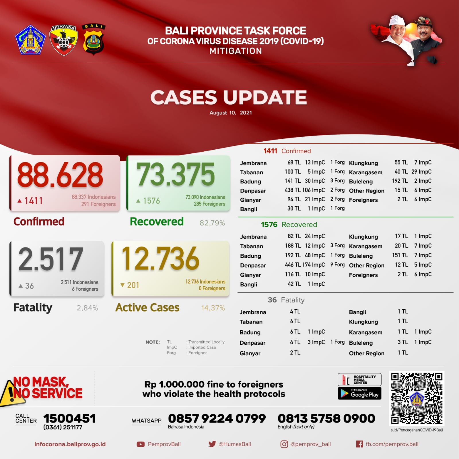 BALIPUSTAKANEWS, DENPASAR – Pertambahan kasus hari ini sebagai berikut, TERKONFIRMASI sebanyak 1.411 orang (1.175 orang melalui Transmisi Lokal, 226 PPDN dan 10 PPLN), SEMBUH sebanyak 1.576 orang dan 36 pasien meninggal dunia.