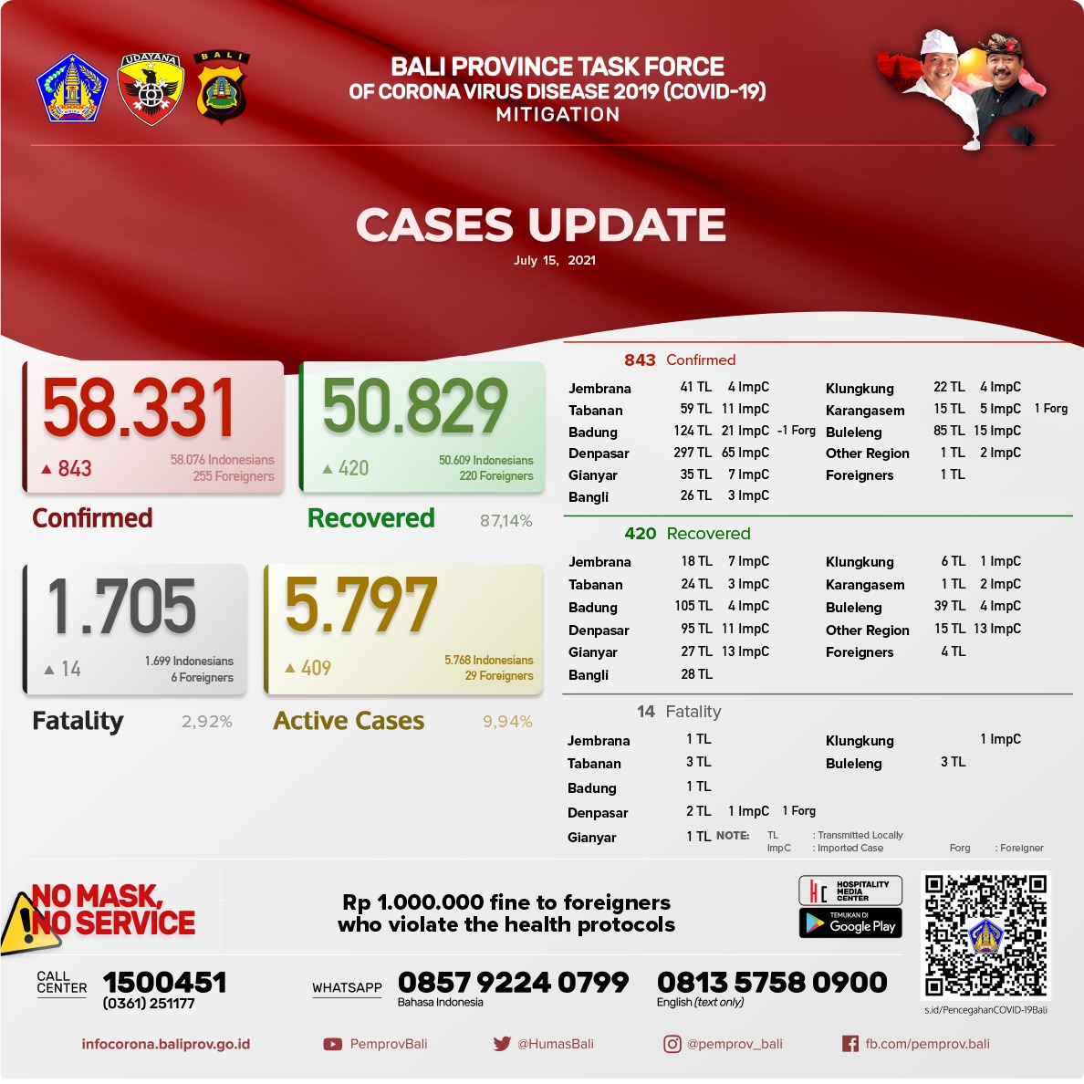 BALIPUSTAKANEWS, DENPASAR –Pertambahan kasus hari ini sebagai berikut, TERKONFIRMASI sebanyak 843 orang (706 orang melalui Transmisi Lokal, 136 PPDN dan 1 PPLN) SEMBUH sebanyak 420 orang dan 14 pasien meninggal dunia.