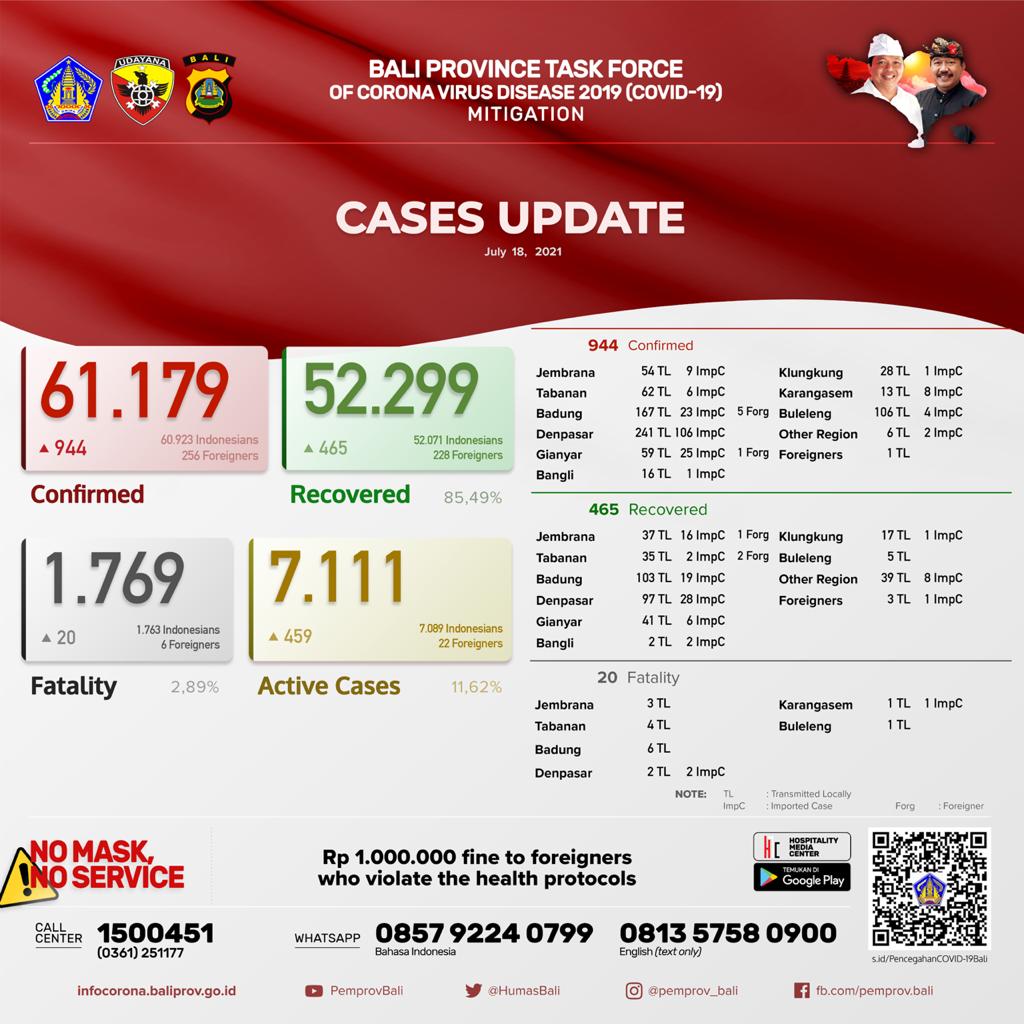 BALIPUSTAKASNEWS, DENPASAR – Pertambahan kasus hari ini sebagai berikut, TERKONFIRMASI sebanyak 944 orang (753 orang melalui Transmisi Lokal, 185 PPDN dan 6 PPLN) SEMBUH sebanyak 465 orang dan 20 pasien meninggal dunia.