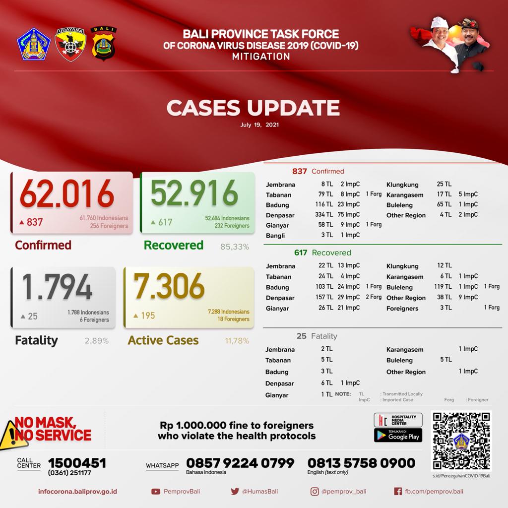 BALIPUSTAKANEWS,DENPASAR – Pertambahan kasus hari ini sebagai berikut, TERKONFIRMASI sebanyak 837 orang (709 orang melalui Transmisi Lokal, 126 PPDN dan 2 PPLN) SEMBUH sebanyak 617 orang dan 25 pasien meninggal dunia.