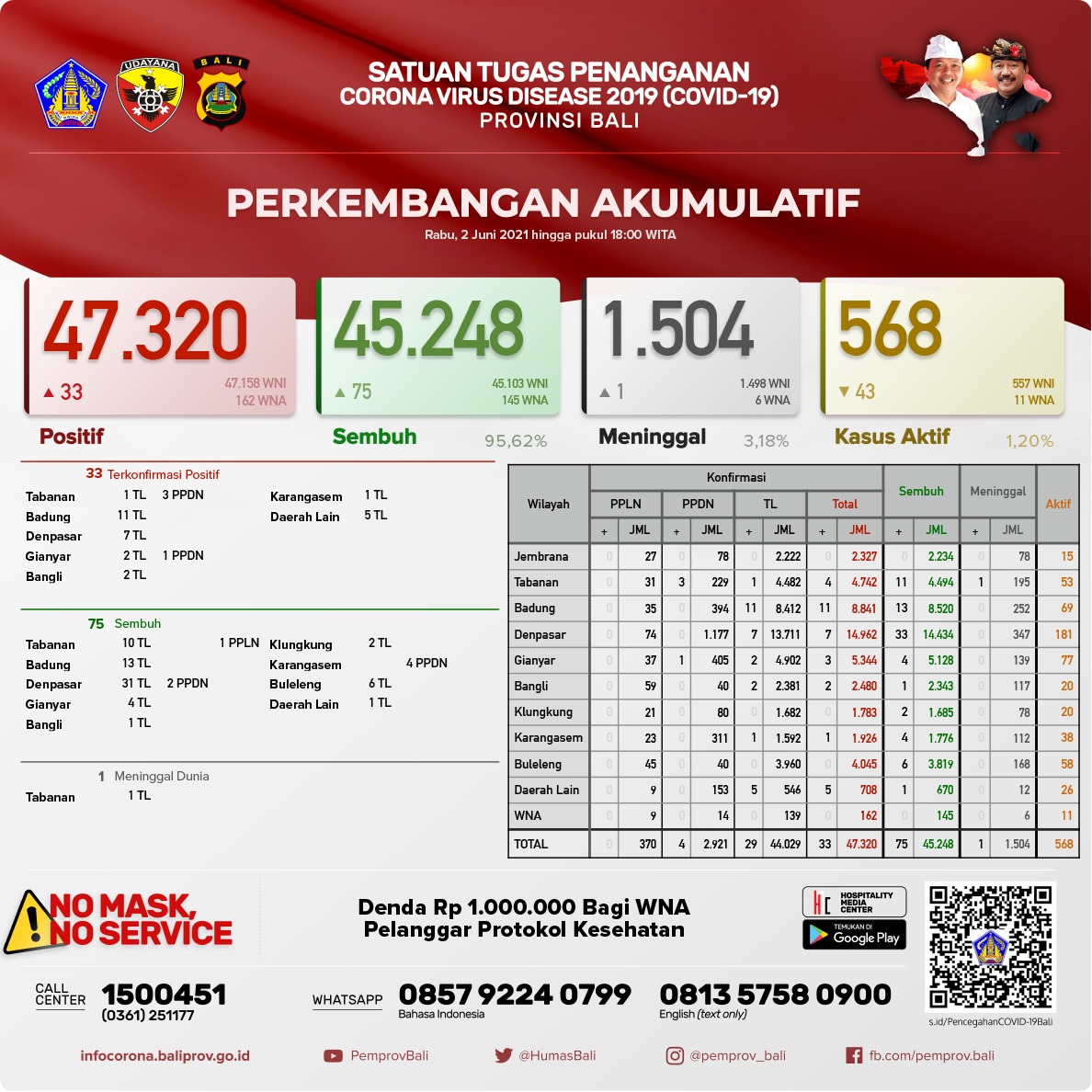 Jumlah kasus secara kumulatif , TERKONFIRMASI 47.320 orang, SEMBUH 45.248 orang (95,62%), dan Meninggal Dunia 1.504 orang (3,18%). Kasus Aktif per hari ini menjadi 568 orang (1,20%).