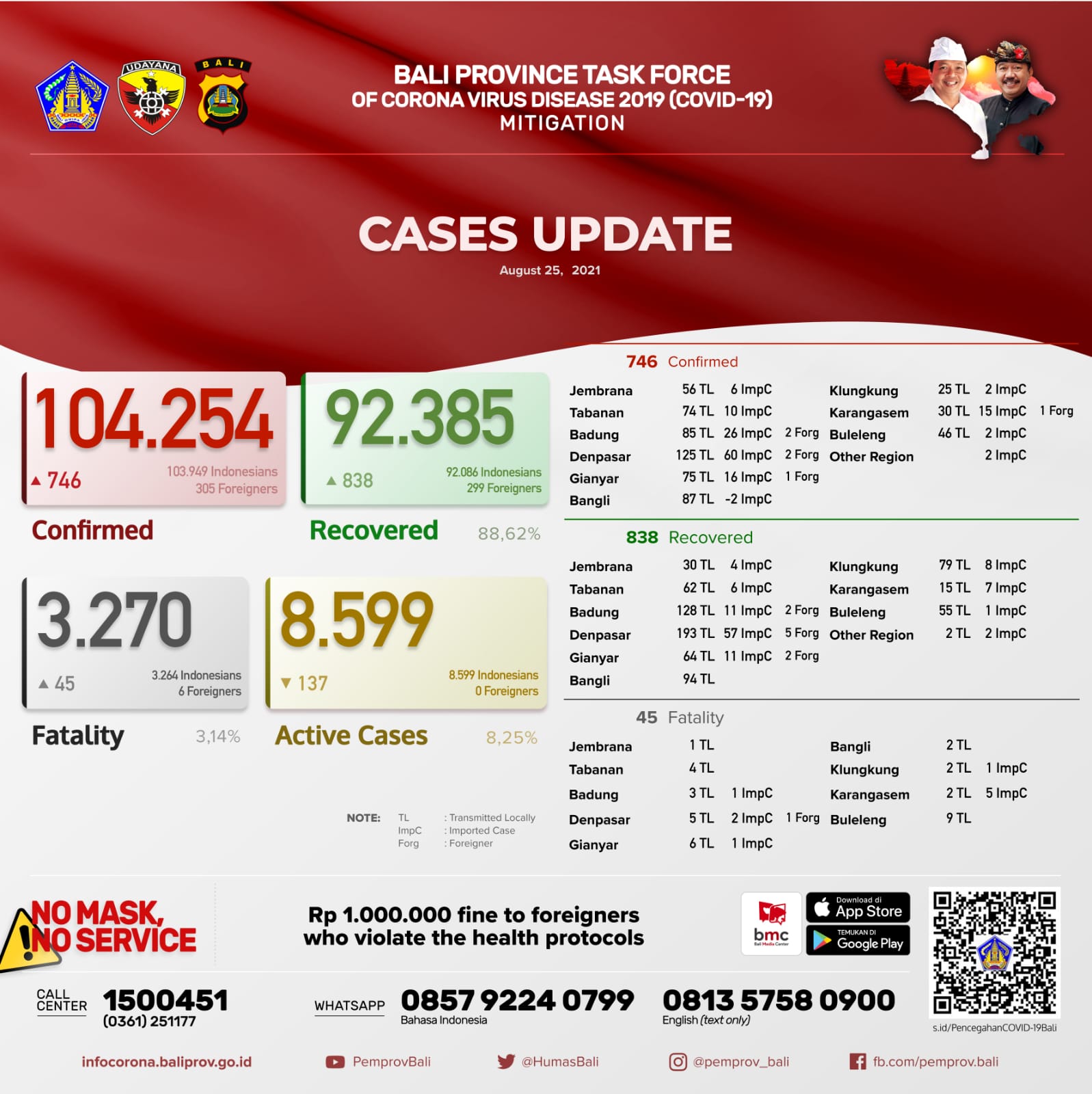 Jumlah kasus secara kumulatif sebagai berikut , TERKONFIRMASI 104.254 orang, SEMBUH 92.385 orang (88,62%), dan Meninggal Dunia 3.270 orang (3.14%).