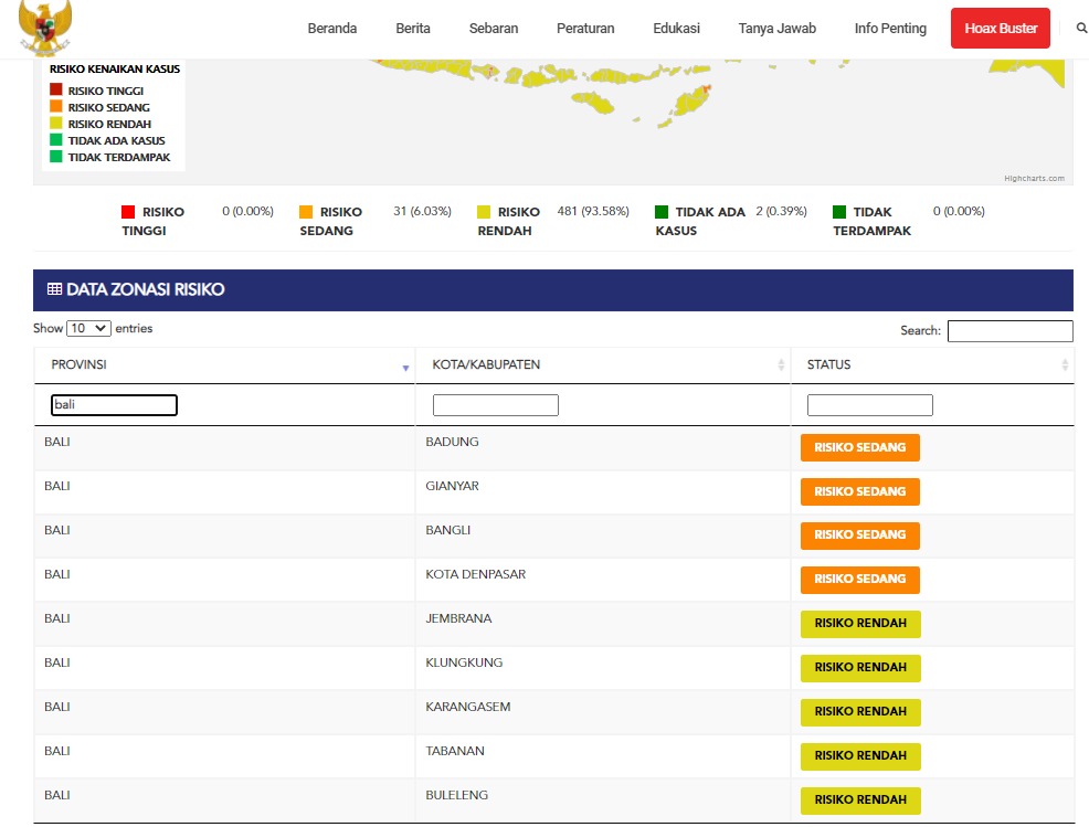 Saat ini sebanyak 3 Kabupaten dan 1 Kota berada di ZONA ORANGE (Kabupaten Badung, Gianyar, Bangli, dan Kota Denpasar). Serta 5 Kabupaten berada di ZONA KUNING (Kabupaten Jembrana, Klungkung, Tabanan, Karangasem, dan Buleleng).
