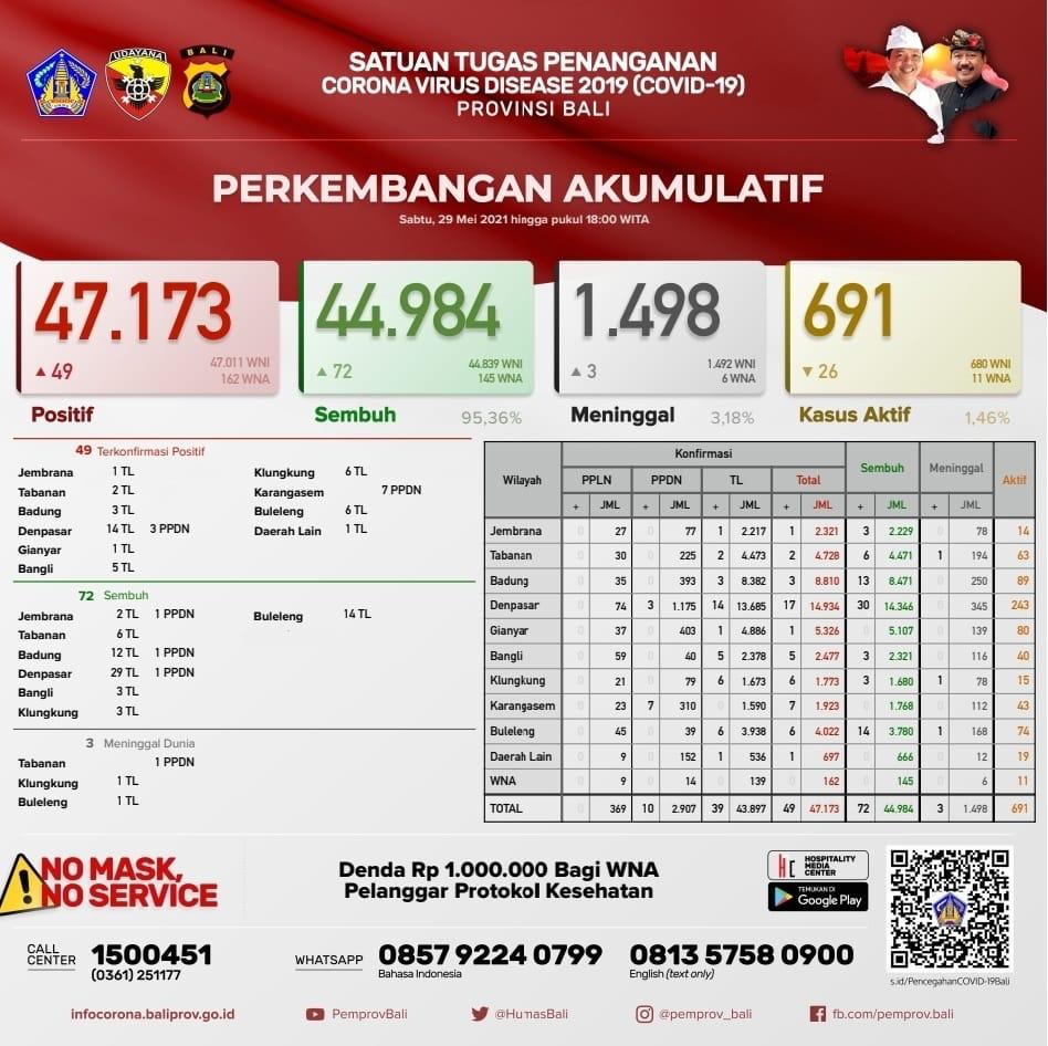 Jumlah kasus secara kumulatif, TERKONFIRMASI 47.173 orang, SEMBUH 44.984 orang (95,36%), dan Meninggal Dunia 1.498 orang (3,18%). Kasus Aktif per hari ini menjadi 691 orang (1,46%).