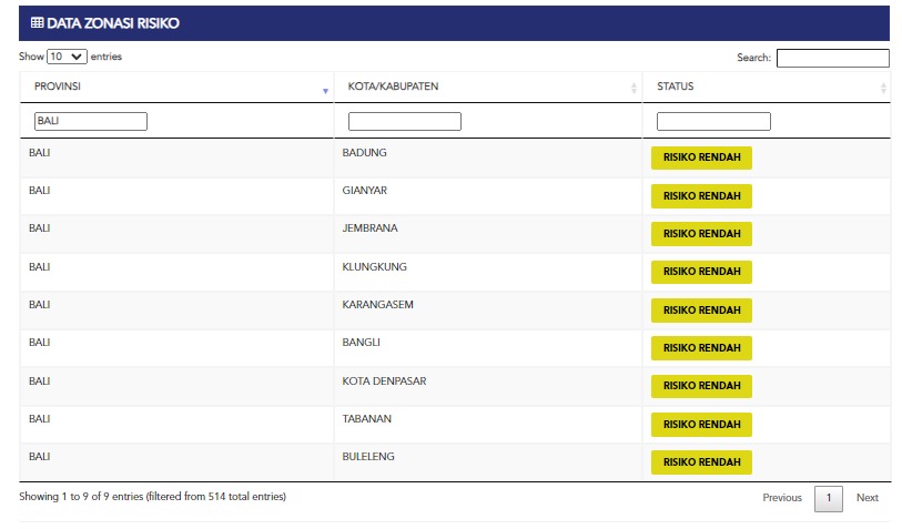 Seluruh Kabupaten / Kota berada pada Zona Kuning / Risiko Rendah (8 Kabupaten dan 1 Kota) : Kabupaten Badung, Gianyar, Bangli, Jembrana, Klungkung, Karangasem, Tabanan, Buleleng, dan Kota Denpasar.