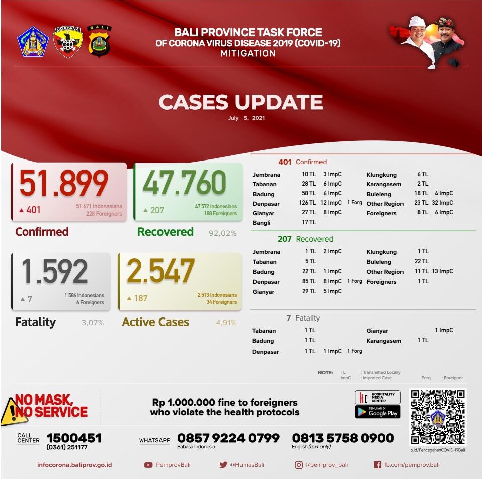 BALIPUSTAKANEWS, DENPASAR – Pertambahan kasus hari ini sebagai berikut , TERKONFIRMASI sebanyak 401 orang (323 orang melalui Transmisi Lokal, 77 PPDN dan 1 PPLN) SEMBUH sebanyak 207 orang dan 7 pasien meninggal dunia.