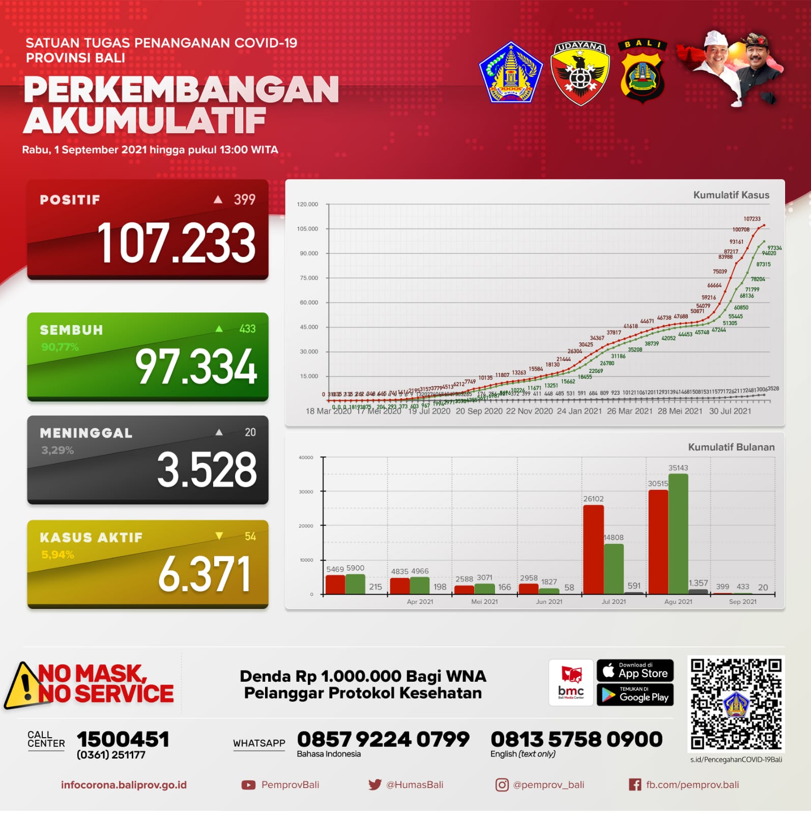 Jumlah kasus secara kumulatif sebagai berikut, TERKONFIRMASI 107.233 orang, SEMBUH 97.334 orang (90,77%), dan Meninggal Dunia 3.528 orang (3,29%). Kasus Aktif per hari ini menjadi 6.371 orang (5,94%).