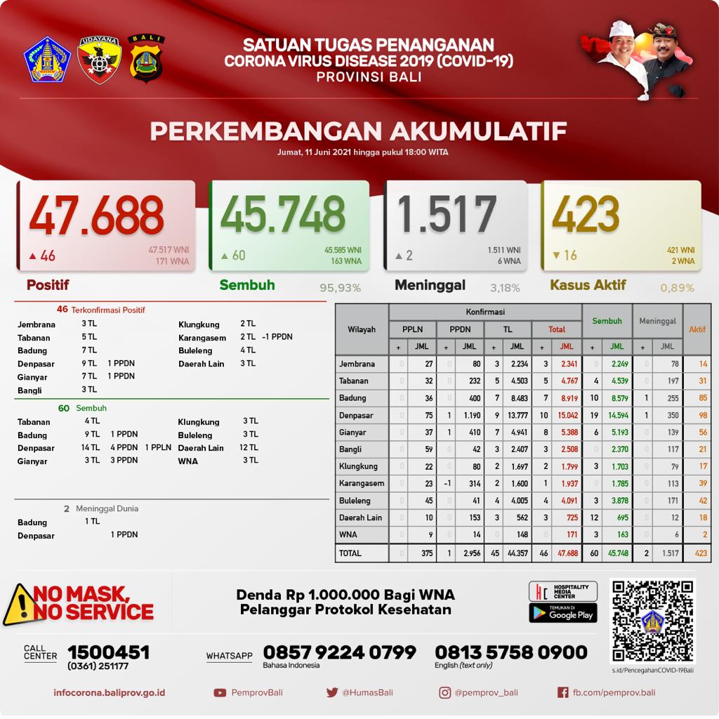 Update kasus Covid 19 Bali Per 11 Juni 2021, Kasus Sembuh 60 & Kasus Baru 46 Orang