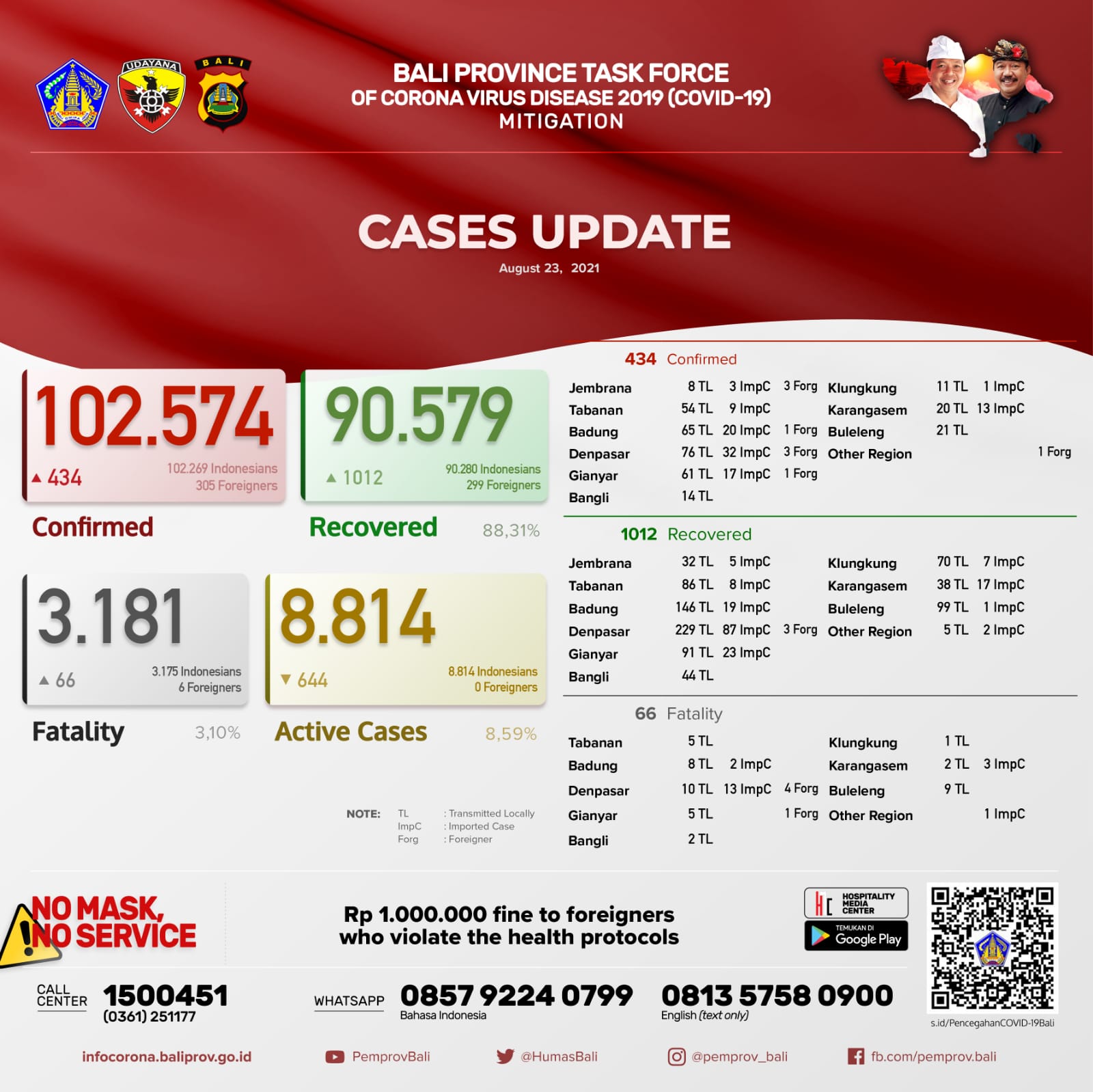 Jumlah kasus secara kumulatif sebagai berikut,TERKONFIRMASI 102.574 orang, SEMBUH 90.579 orang (88,31%), dan Meninggal Dunia 3.181 orang (3.10%). Kasus Aktif per hari ini menjadi 8.814 orang (8,59%).