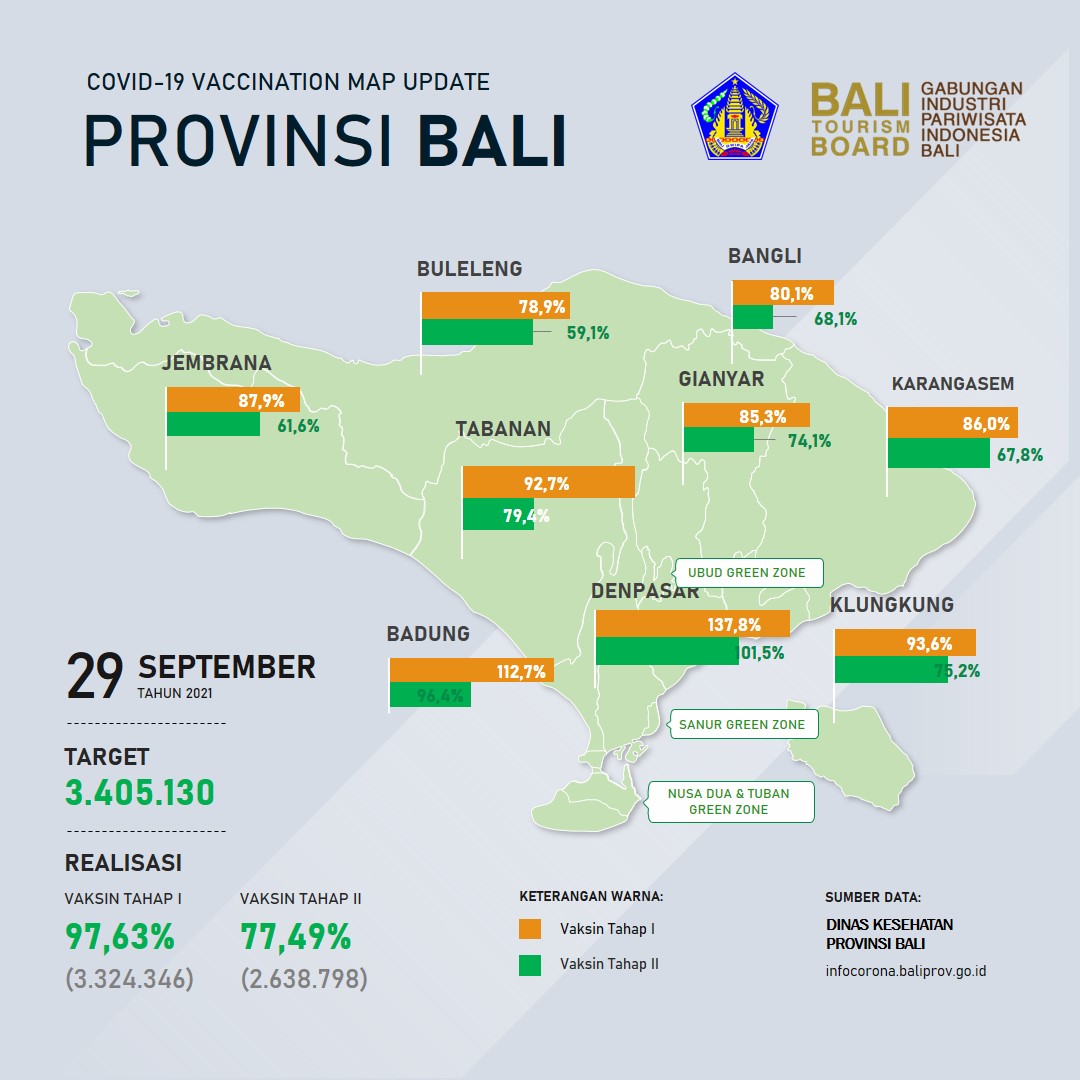Saat ini sebanyak 3 Kabupaten dan 1 Kota berada di ZONA ORANGE (Kabupaten Badung, Gianyar, Bangli, dan Kota Denpasar). Serta 5 Kabupaten berada di ZONA KUNING (Kabupaten Jembrana, Klungkung, Tabanan, Karangasem, dan Buleleng).