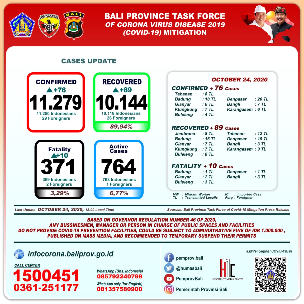 BALIPUSTAKANEWS – Perkembangan Pandemi Covid-19 di Provinsi Bali per hari ini mencatat pertambahan kasus, TERKONFIRMASI sebanyak 76 orang melalui Transmisi Lokal, SEMBUH sebanyak 89 orang, dan Meninggal Dunia sebanyak 10 orang. Jumlah kasus secara kumulatif, Terkonfirmasi Positif 11.279 orang, Sembuh 10.144 orang (89,94%), dan Meninggal Dunia 371 orang (3,29%). Kasus Aktif per hari ini menjadi 764 orang (6,77%), yang tersebar dalam perawatan di 17 RS rujukan dan dikarantina di Bapelkesmas, UPT Nyitdah, Wisma Bima dan BPK Pering.