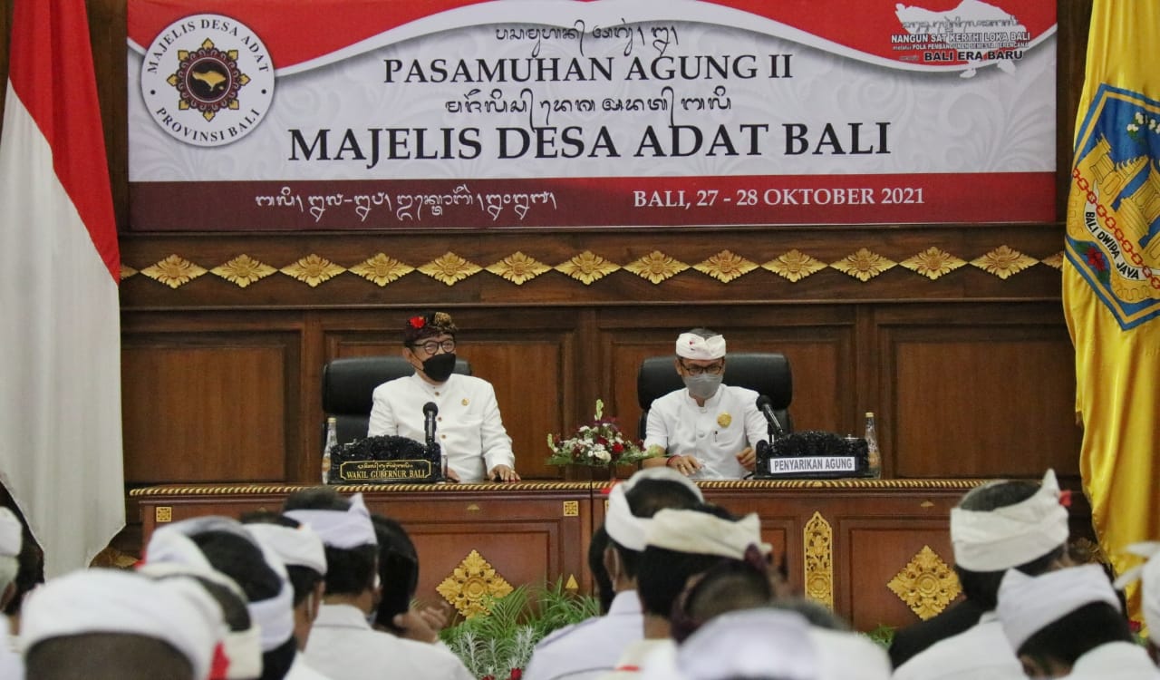 BALIPUSTAKANEWS,DENPASAR – Gubernur Bali Wayan Koster yang diwakili Wagub Prof. Tjokorda Oka Artha Ardhana Sukawati (Cok Ace) membuka Pasamuhan Agung II Majelis Desa Adat (MDA) Bali di Ruang Wiswa Sabha Utama Kantor Gubernur Bali, Rabu (27/10/2021). Pasamuhan agung ini akan berlangsung selama 2 hari, dari tanggal 27 hingga 28 Oktober 2021. Pada hari pertama, pasamuhan agung yang melibatkan MDA Provinsi, Kabupaten/Kota dan Kecamatan se-Bali digelar secara offline di Ruang WSU Kantor Gubernur, sementara pelaksanaan pada hari ke-2 akan berlangsung secara daring.