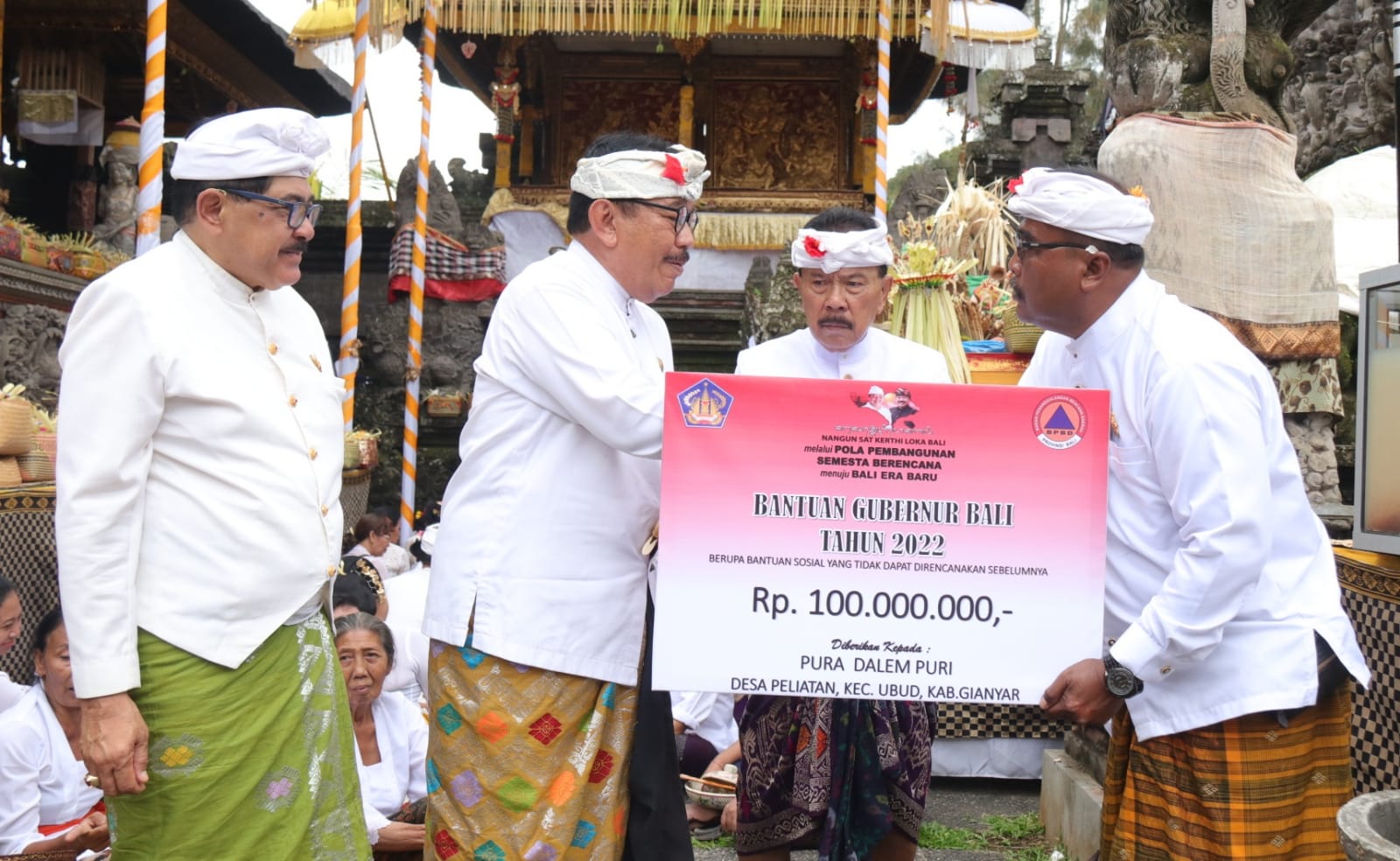 Melanjutkan pesan dari Gubernur, ia berharap semangat nangun yadnya dapat terus dilanjutkan karena merupakan warisan leluhur secara turun temurun. Konsep yadnya ini terkait erat dengan ajaran Hindu yang meyakini hidup tak lepas dari ‘Rna’ (hutang, red). “Ida Betara sweca, kita juga harus menunjukkan rasa bhakti. Yadnya bukan dihitung berdasarkan kecil besarnya, tapi dari keiklasan kita dalam melaksanakannya,” urainya. Sebagai wujud dukungan, Pemprov Bali memberikan bantuan sebesar Rp. 100 juta sebagai biaya renovasi pelinggih yang tersambar petir. Menurut Wagub Cok Ace, jumlah tersebut mungkin tak menutup seluruh biaya yang dikeluarkan. Tapi menurutnya ini menjadi bukti kehadiran pemerintah di tengah masyarakat.