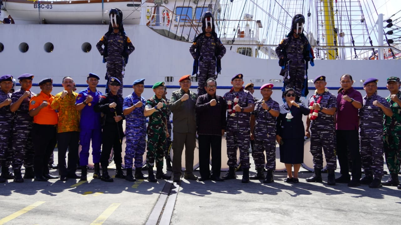BALIPUSTAKANEWS,DENPASAR – Wakil Gubernur Prof. Tjokorda Oka Artha Ardhana Sukawati (Cok Ace) bersama jajaran Forum Komunikasi Pimpinan Daerah (Forkopimda) Bali menyambut kedatangan KRI Bima Suci-945 yang bersandar di Dermaga Timur Pelabuhan Benoa, Selasa (11/10/2022). Untuk diketahui, ini adalah kali kedua KRI Bima Suci singgah di perairan Bali setelah sandar perdana pada bulan Oktober 2019 lalu. Penyambutan kapal latih yang diresmikan pada tahun 2017 ini ditandai pengalungan bunga oleh Wagub Cok Ace kepada Komandan KRI Bima Suci-945 Letkol Laut (P) Muhammad Sati Lubis.