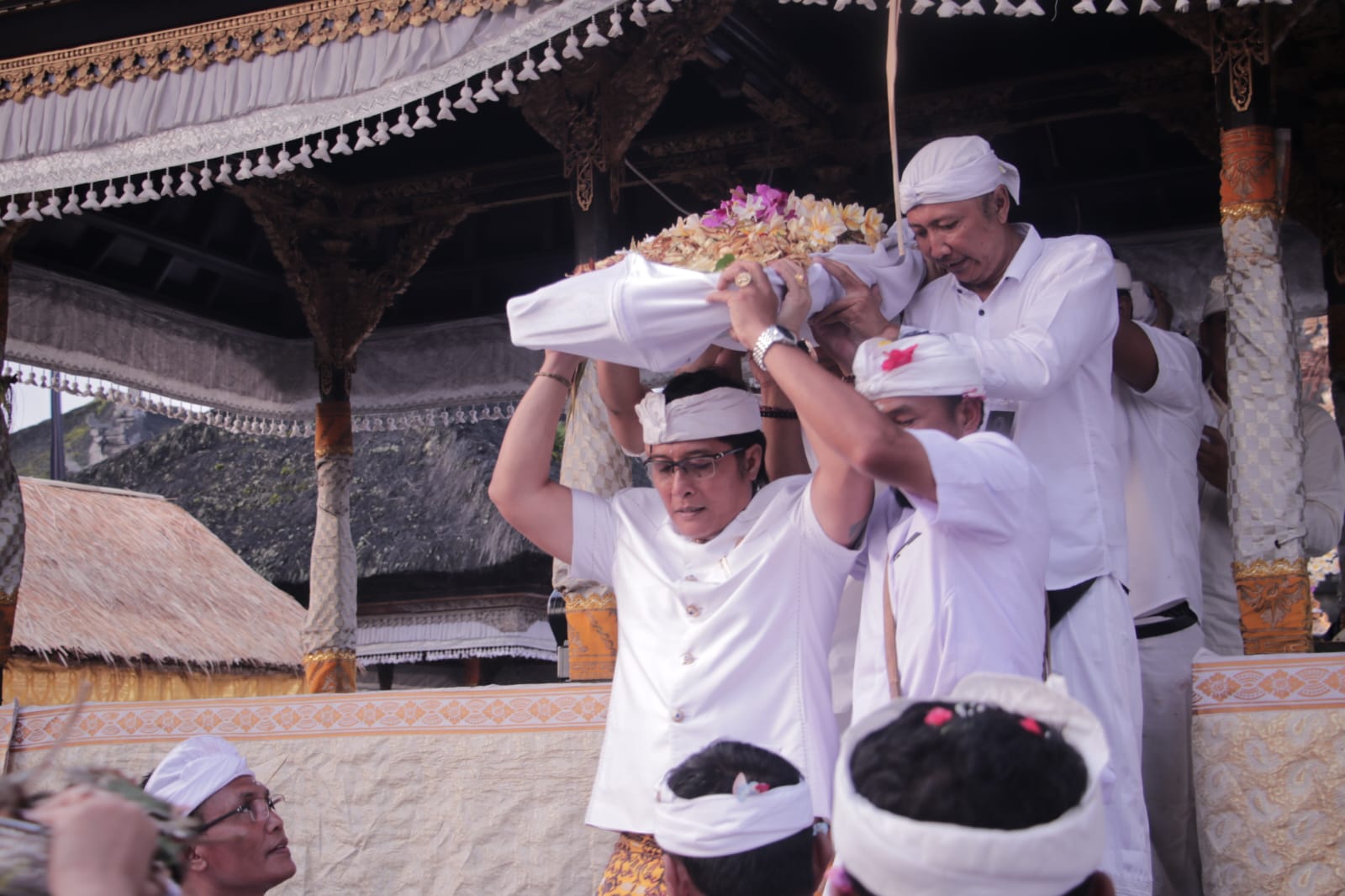 Didampingi Sekda Provinsi Bali Dewa Made Indra, Wagub turut ngayah dalam prosesi Nuek Bagia Pula Kerthi, simbol akumulasi perbuatan baik selama karya suci berlangsung.